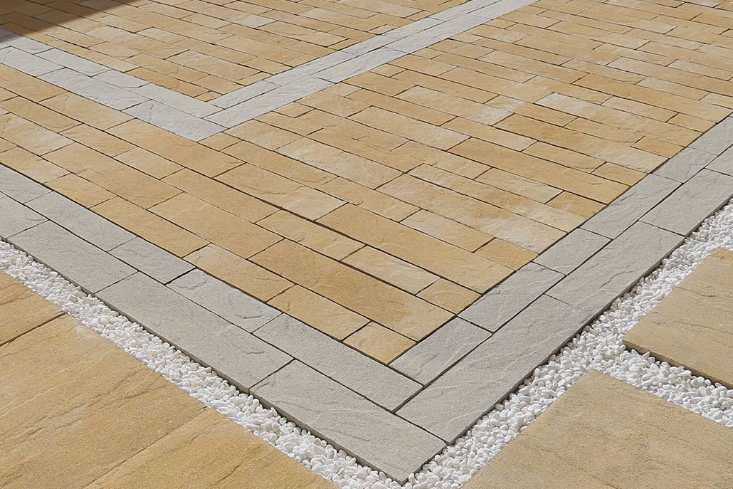 Decado Desert Stone draws inspiration from nature, specifically the desert. The paver is made out of rectangular sand-colored bricks with contrasting dark and light hues, giving it a sophisticated appearance. Highly durable and composed of high-quality concrete.