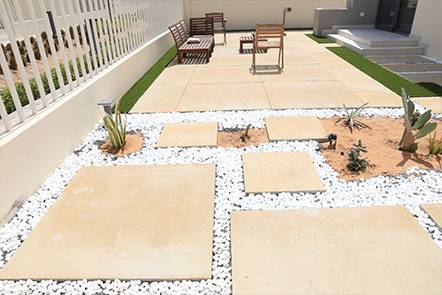 Allow yourself to get swept away by the enticing attraction of the desert-inspired slab. Symmetrically designed squares are supplemented with meticulously inserted small wavy motifs, giving the paver an appealing yet slightly rough surface that is necessary for anti-skidding.