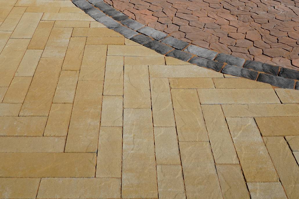 Decado Desert Stone draws inspiration from nature, specifically the desert. The paver is made out of rectangular sand-colored bricks with contrasting dark and light hues, giving it a sophisticated appearance. Highly durable and composed of high-quality concrete.